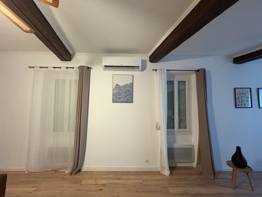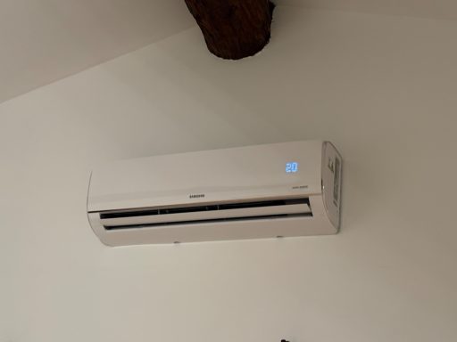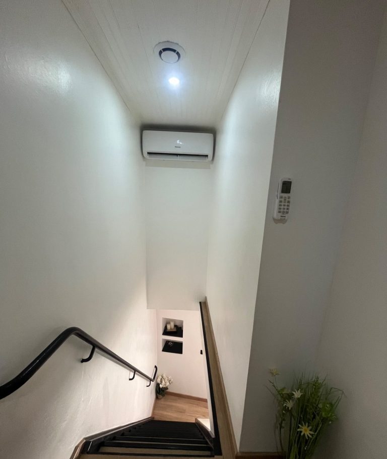 Climatisation multisplit de marque Hisense d'une puissance de 3.5Kw + 3.5Kw: un split installé dans le salon puis un autre installé dans le couloir du deuxième étage pour desservir les 2 chambres.
