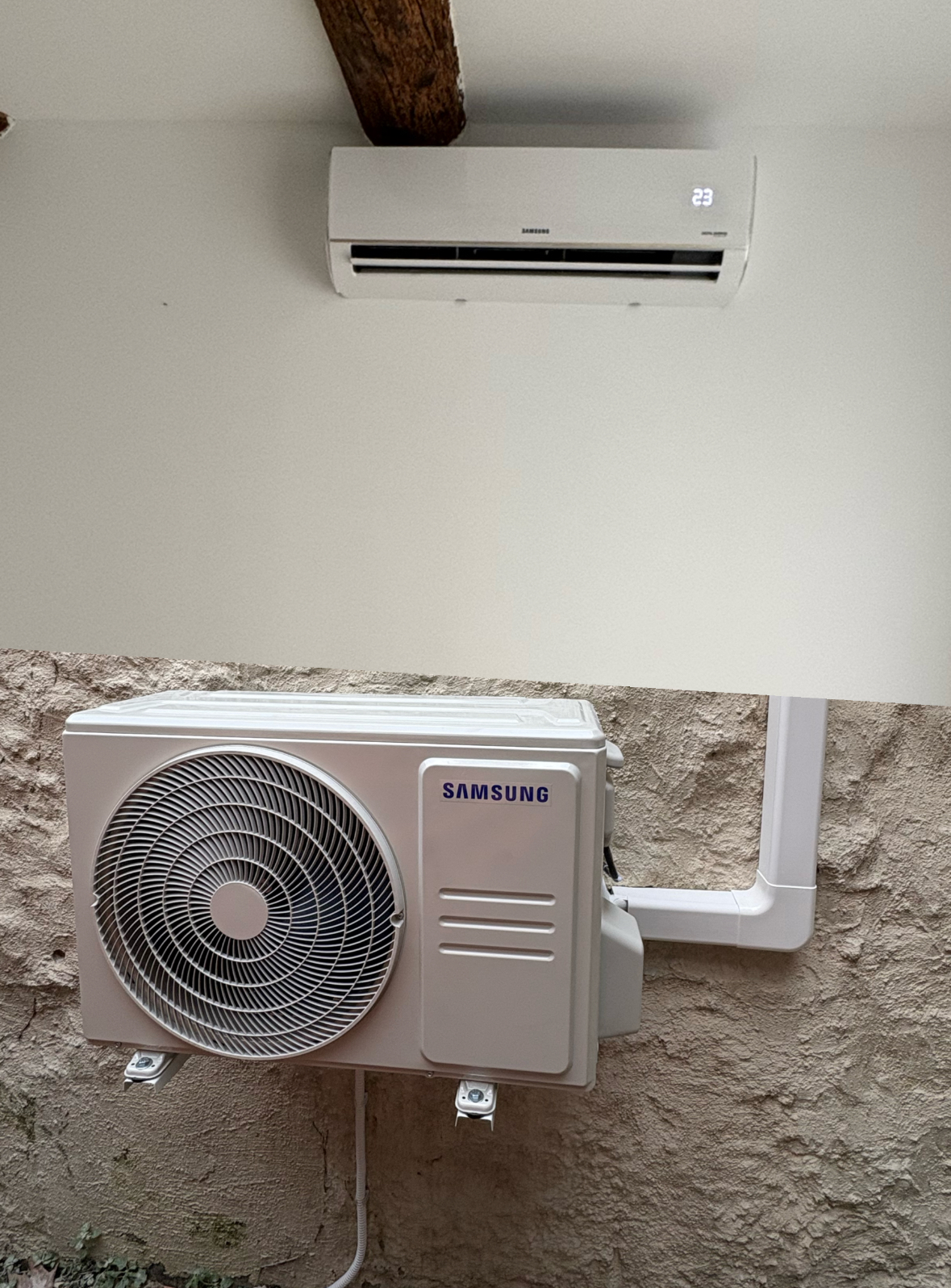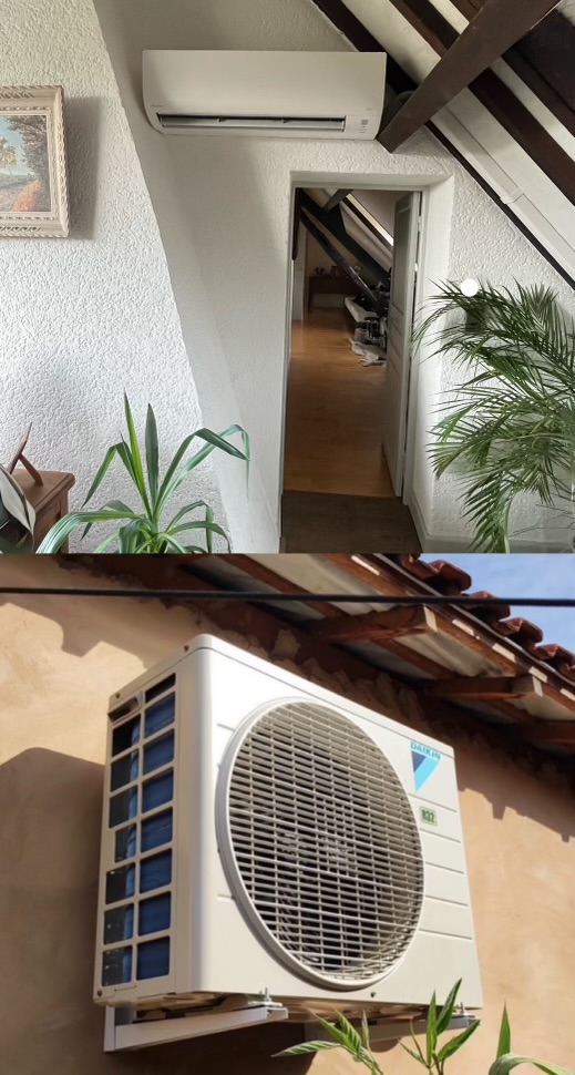 Climatisation multisplit de marque Hisense d'une puissance de 3.5Kw + 3.5Kw: un split installé dans le salon puis un autre installé dans le couloir du deuxième étage pour desservir les 2 chambres.
